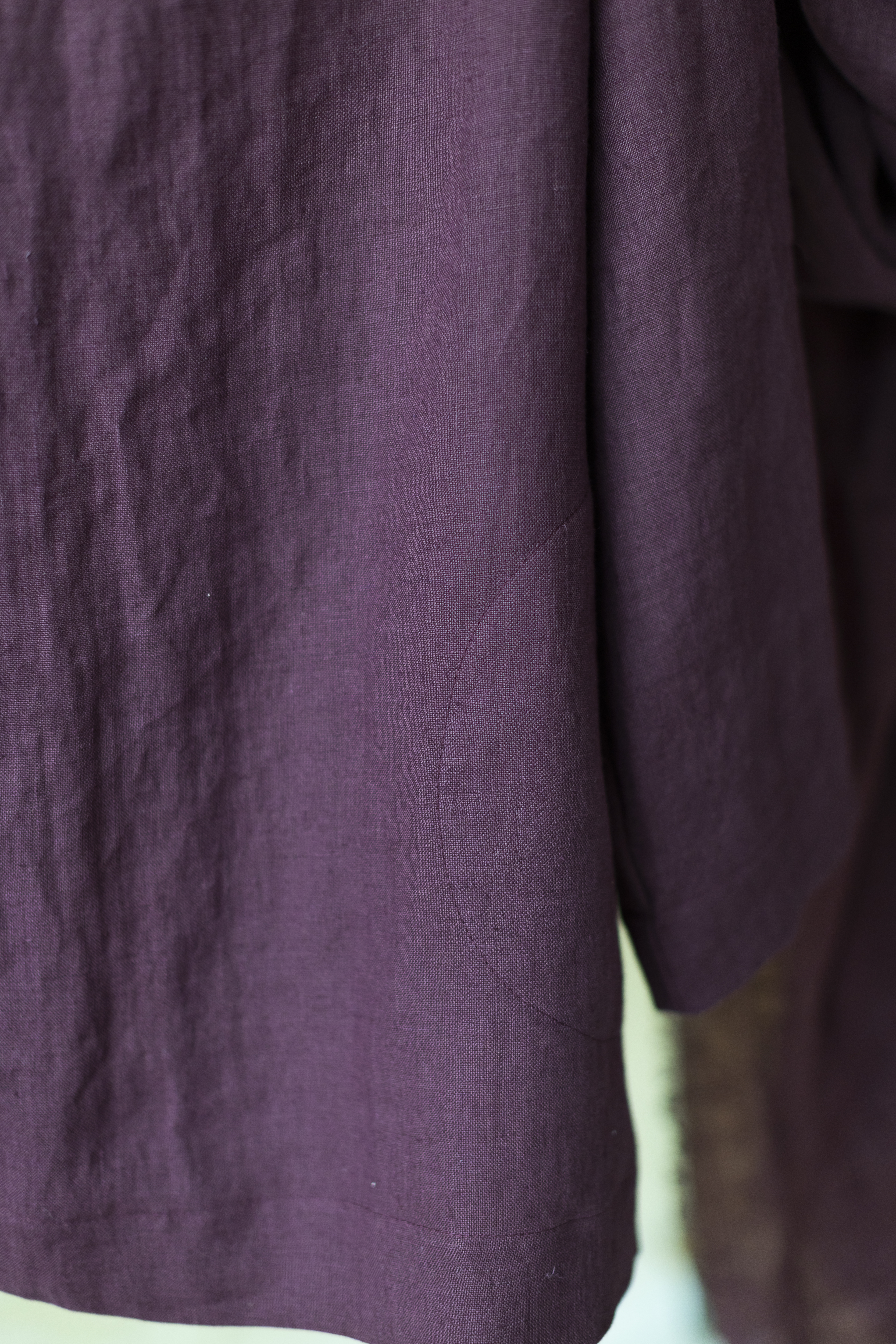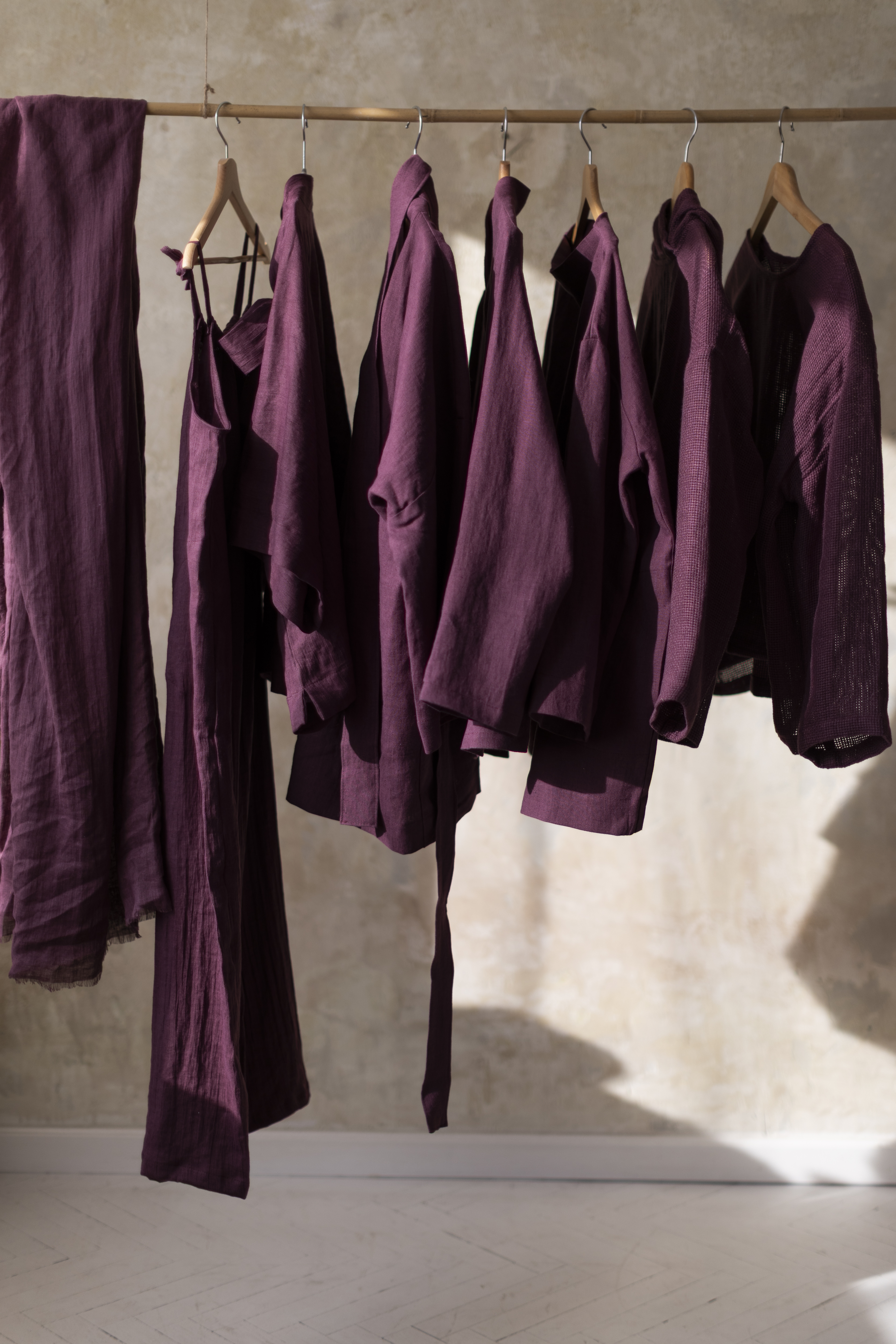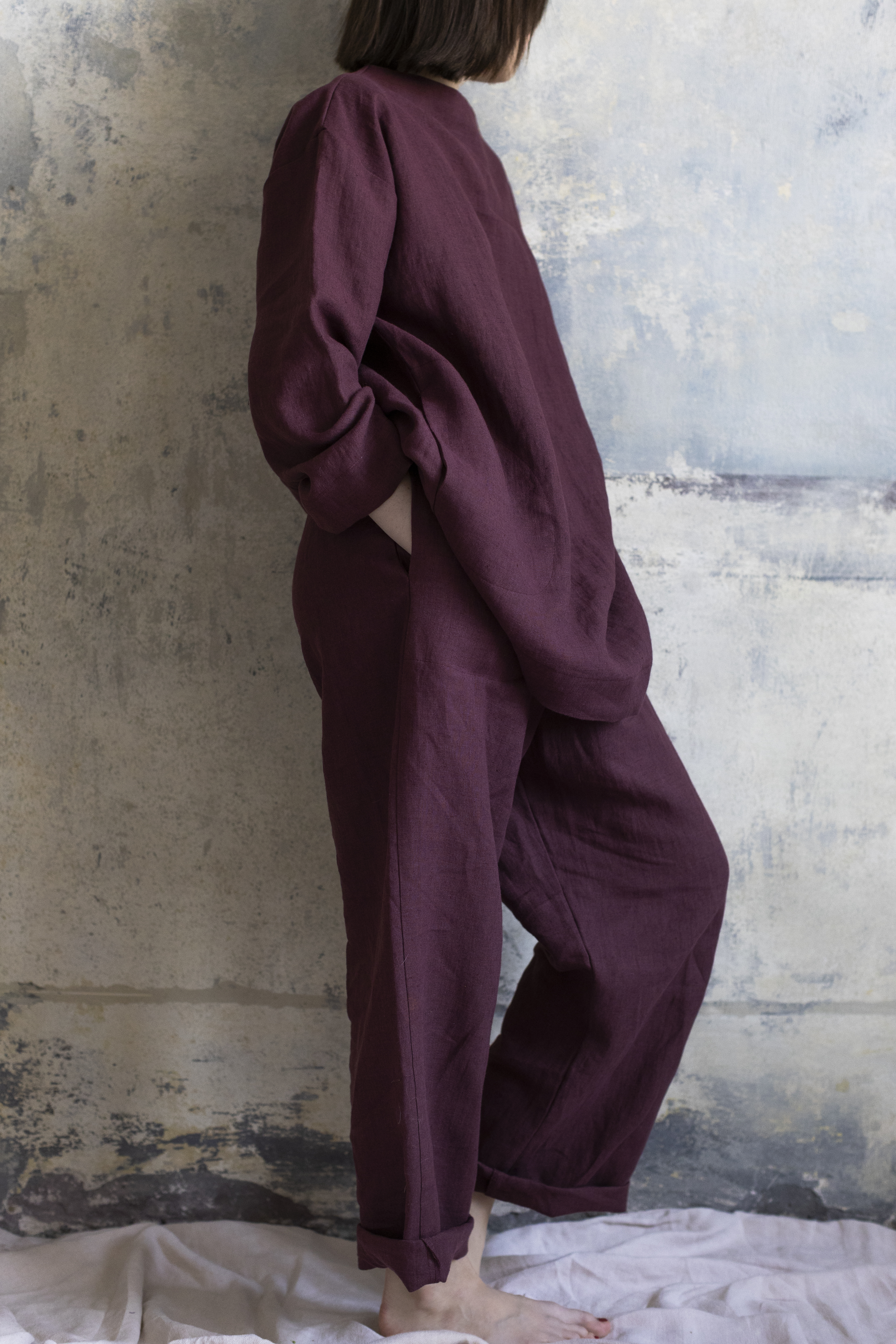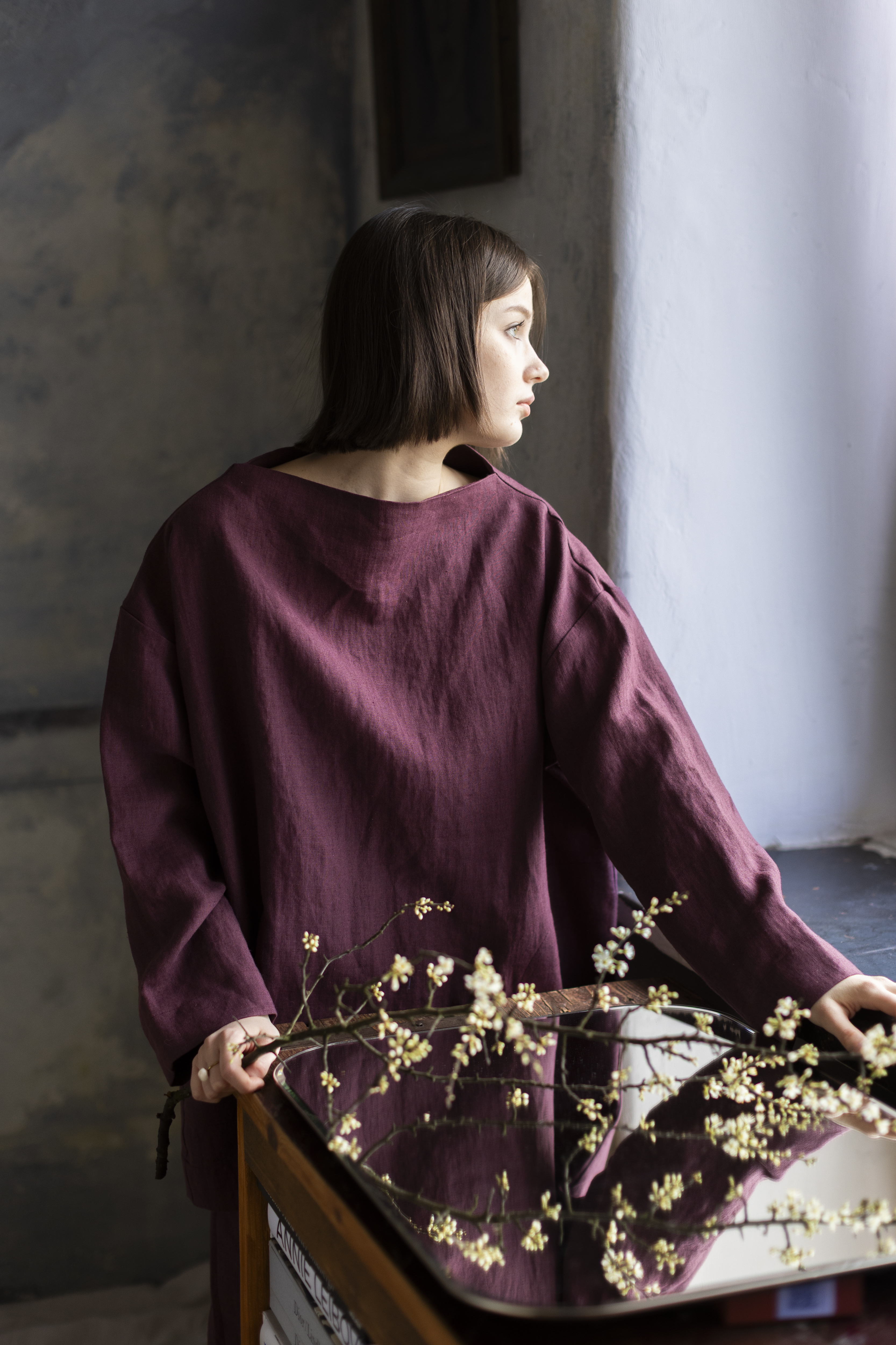 Minimalistyczna lniana bluza w kolorze prowansalskiej figi — cisza, komfort i świadoma elegancja