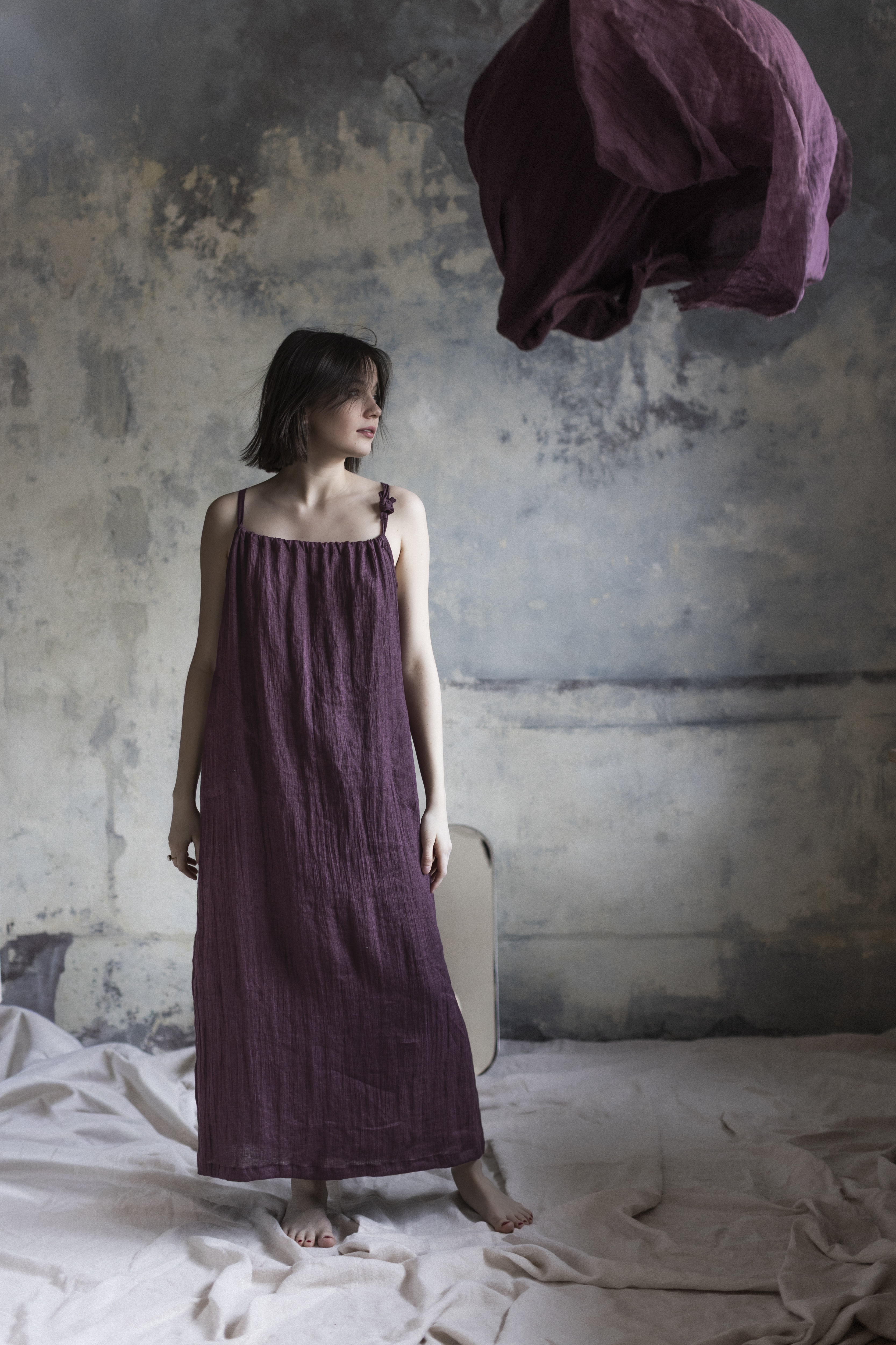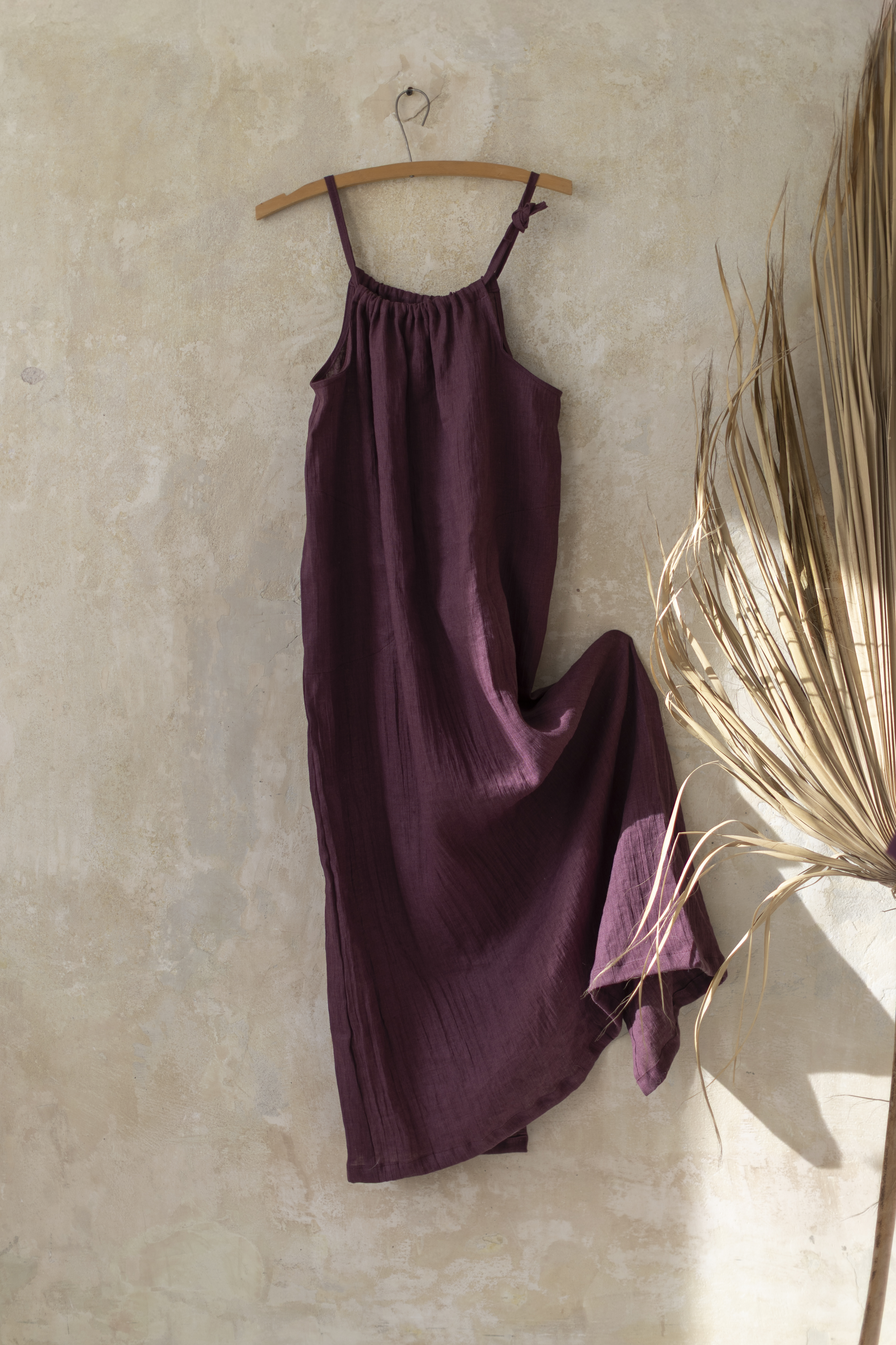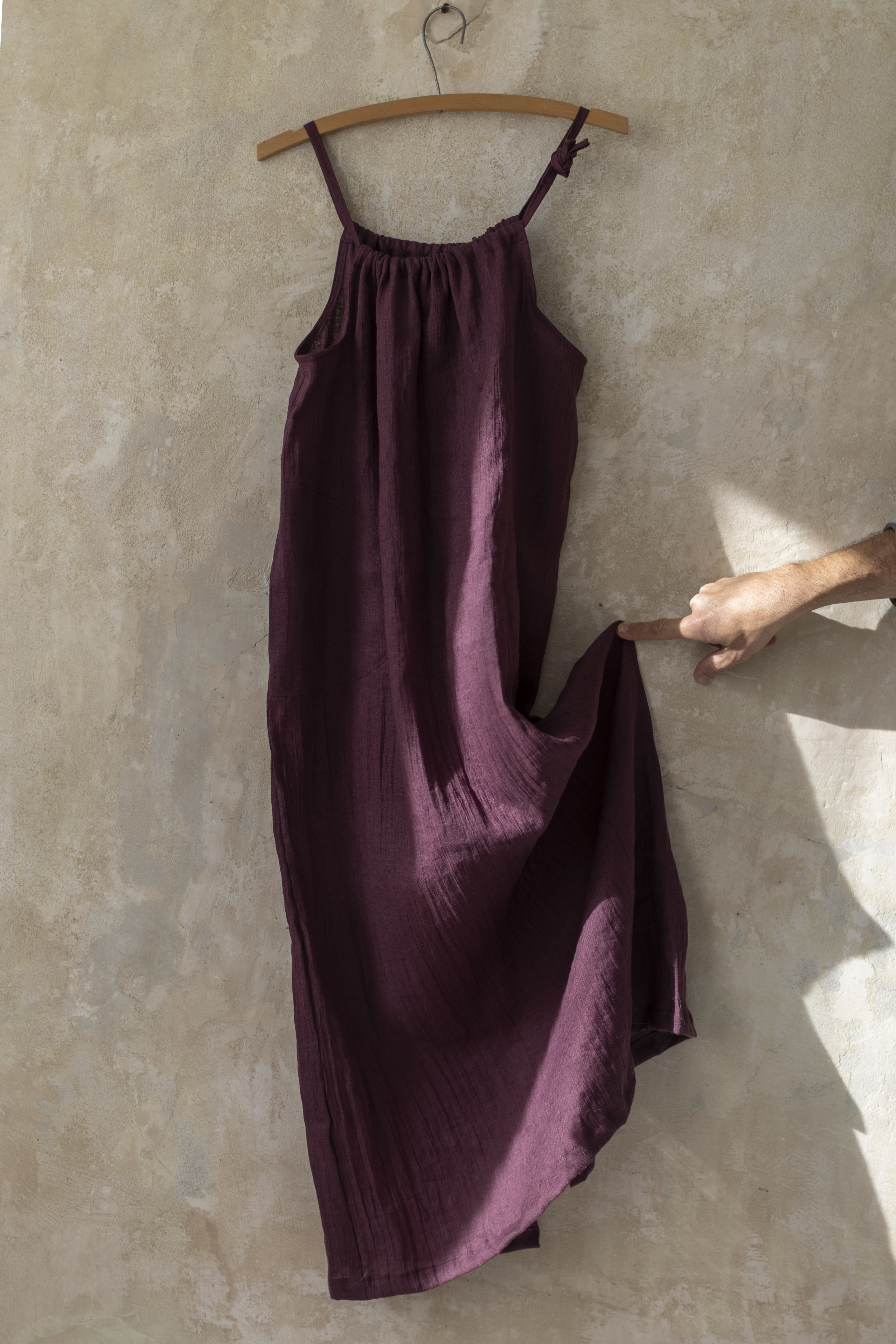 Sukienka powstaje ręcznie w naszej kameralnej pracowni w Polsce, gdzie rzemiosło spotyka się z uważnością i szacunkiem do natury. Tworzona z naturalnych, biodegradowalnych materiałów, jest wyborem świadomym — bliskim ciału i środowisku.
