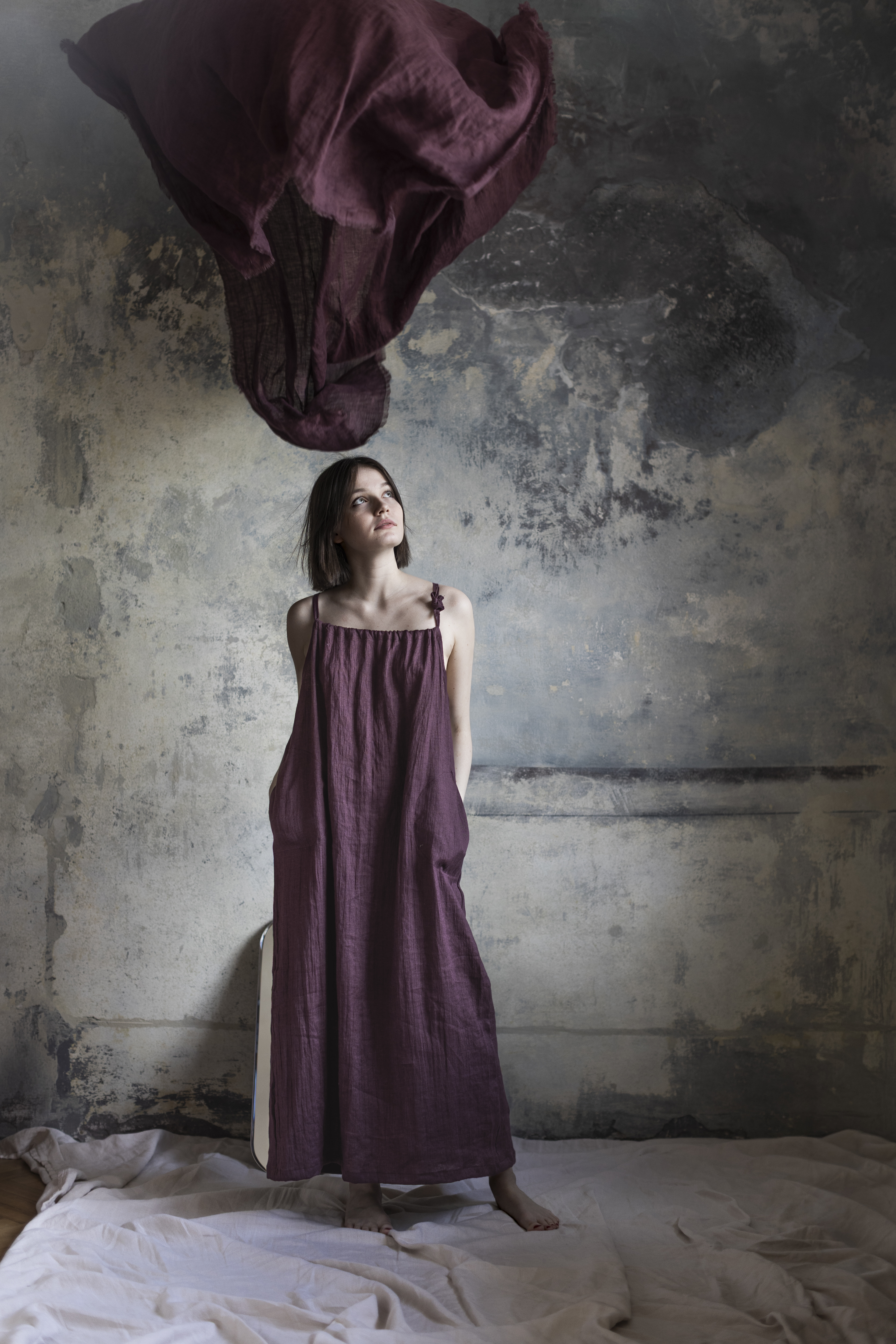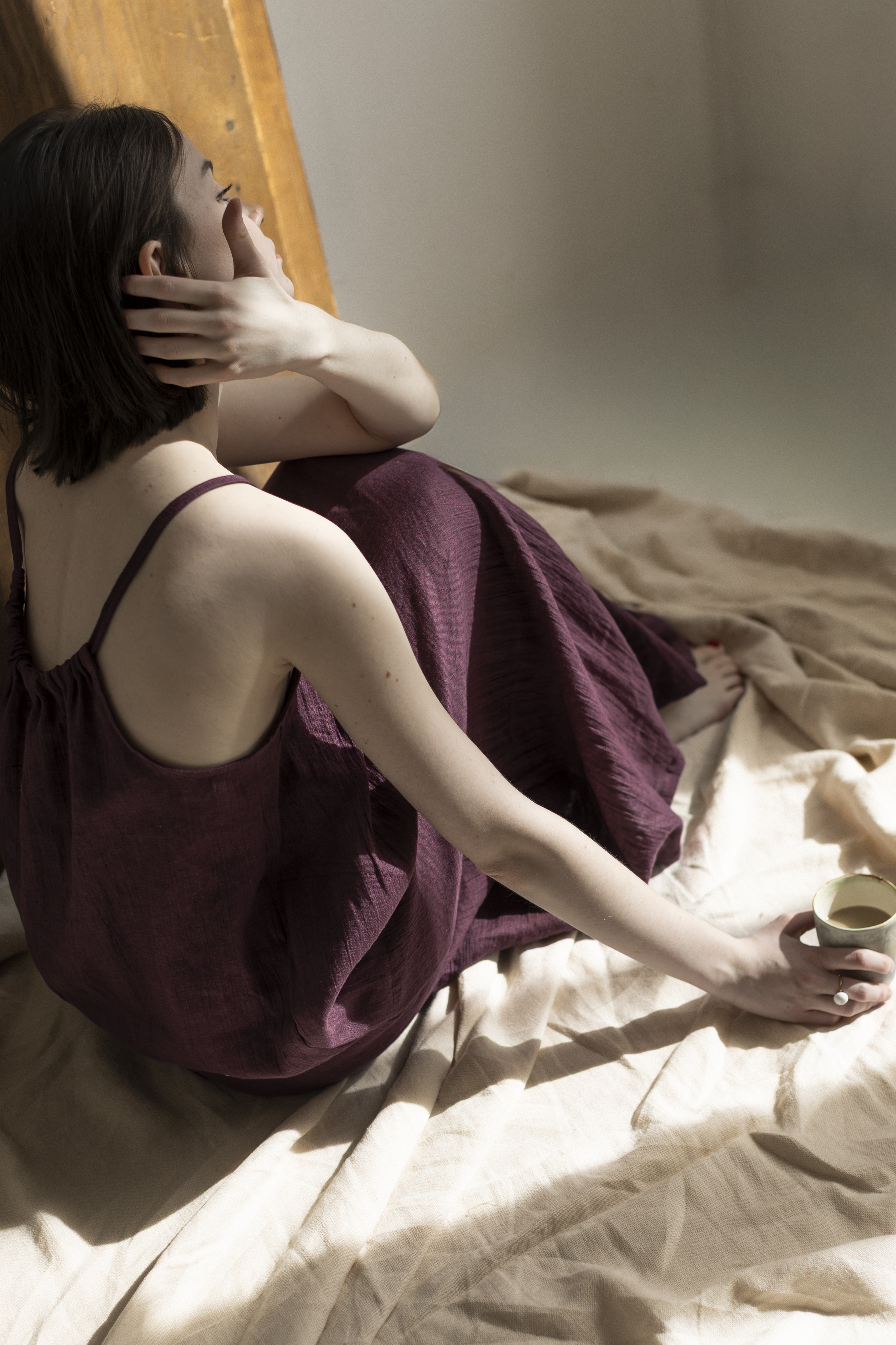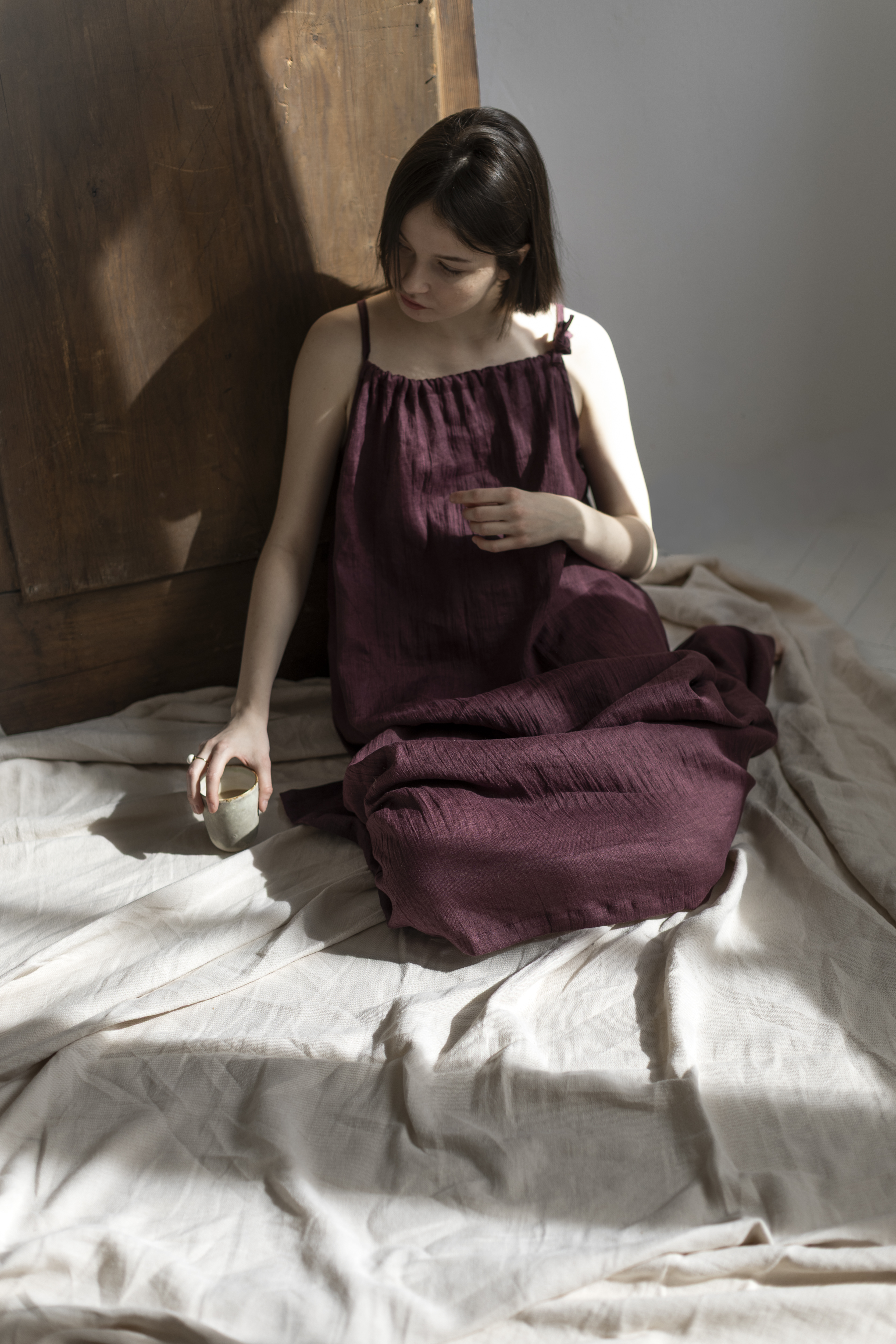 Sukienka powstaje ręcznie w naszej kameralnej pracowni w Polsce, gdzie rzemiosło spotyka się z uważnością i szacunkiem do natury. Tworzona z naturalnych, biodegradowalnych materiałów, jest wyborem świadomym — bliskim ciału i środowisku.