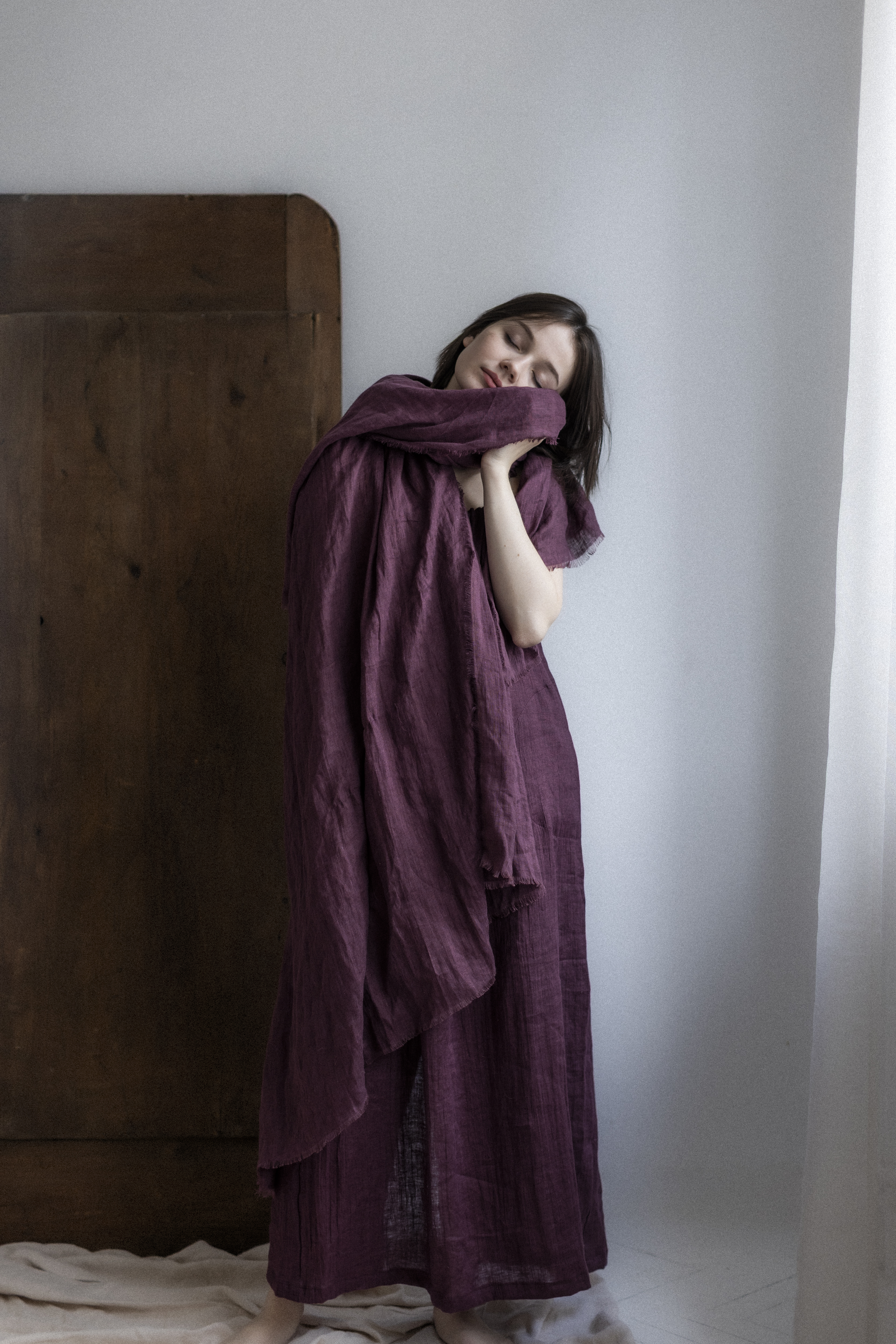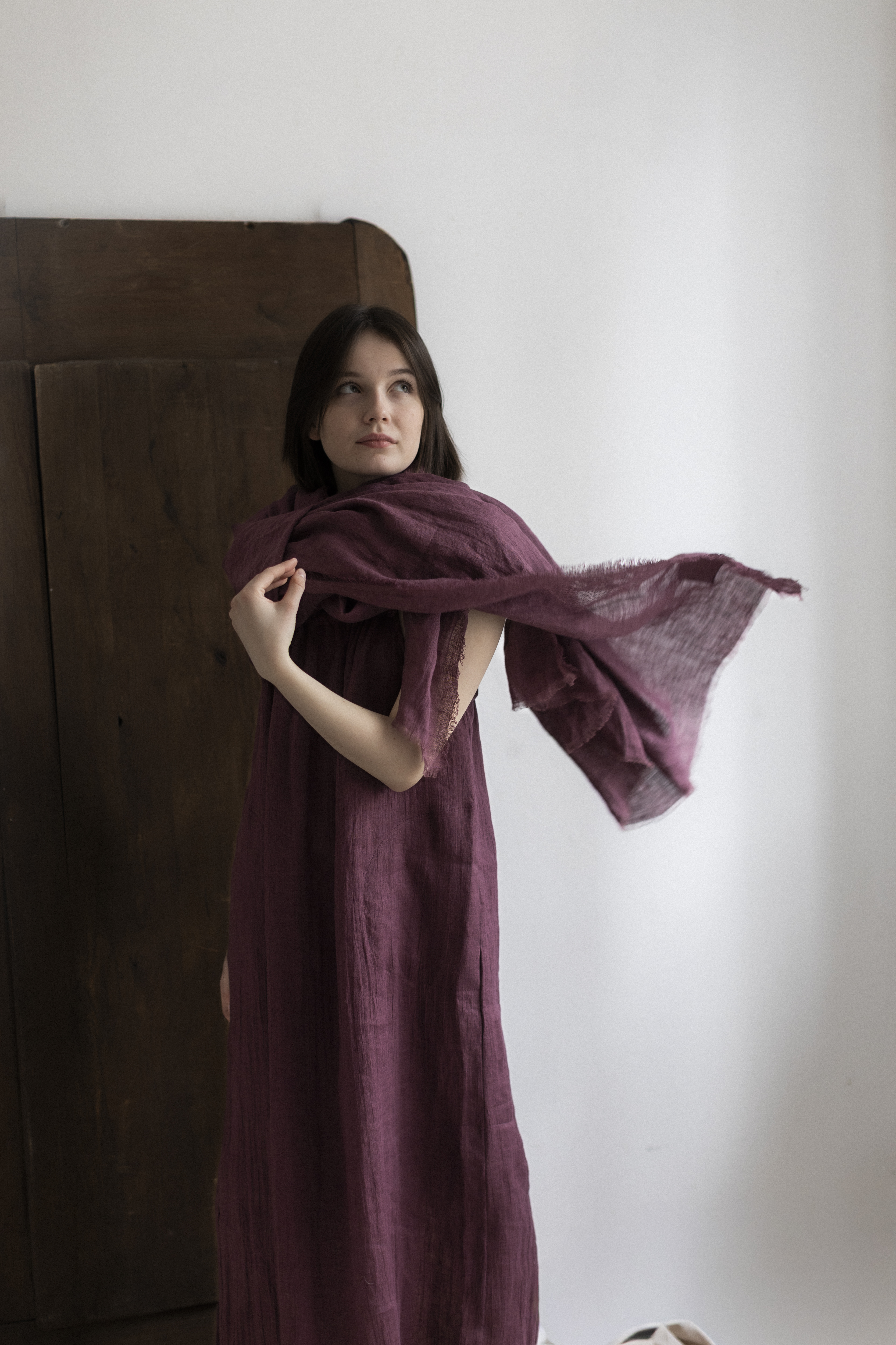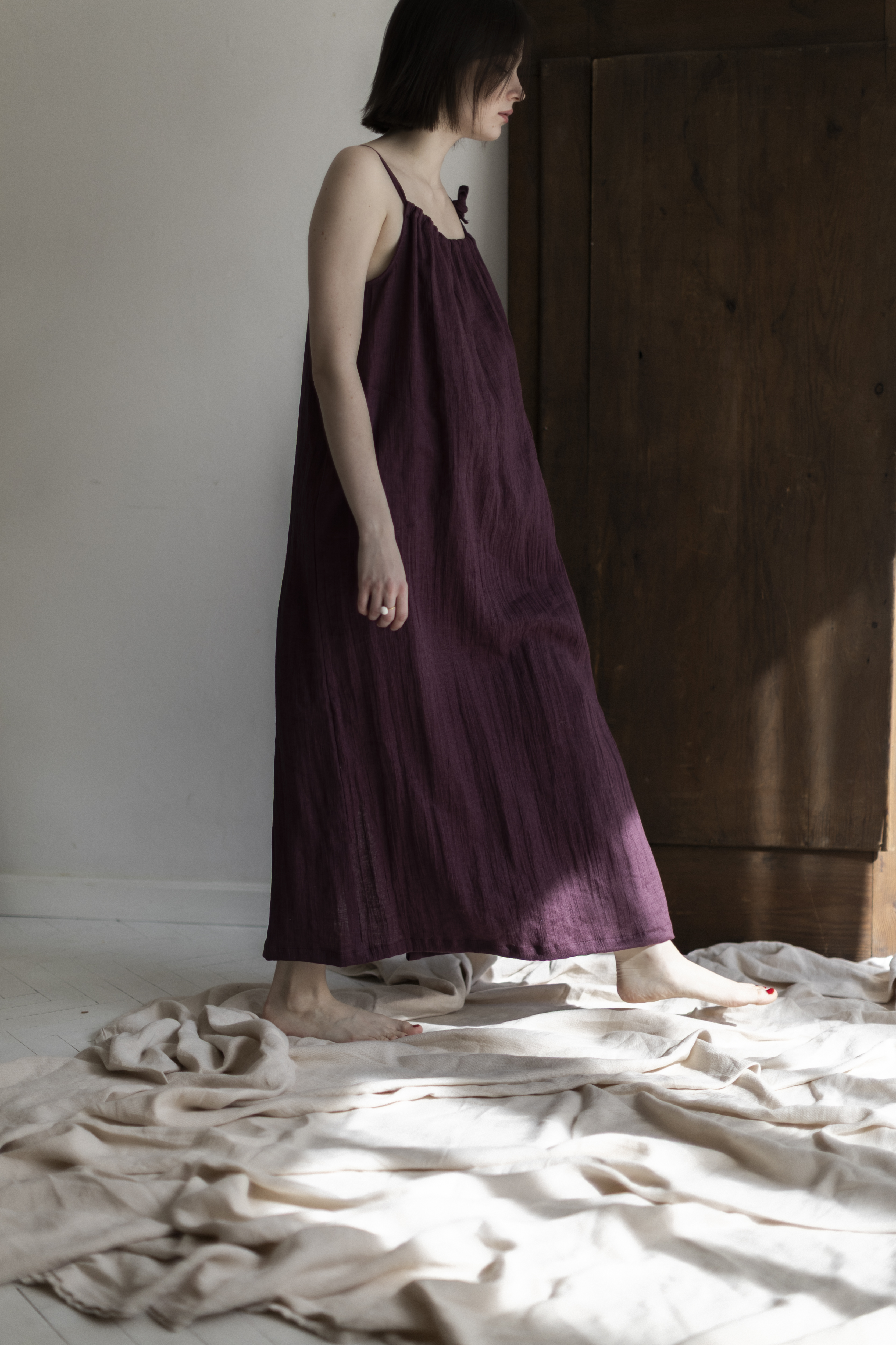 Lniana sukienka w kolorze prowansalskiej figi – ręcznie szyta w Polsce