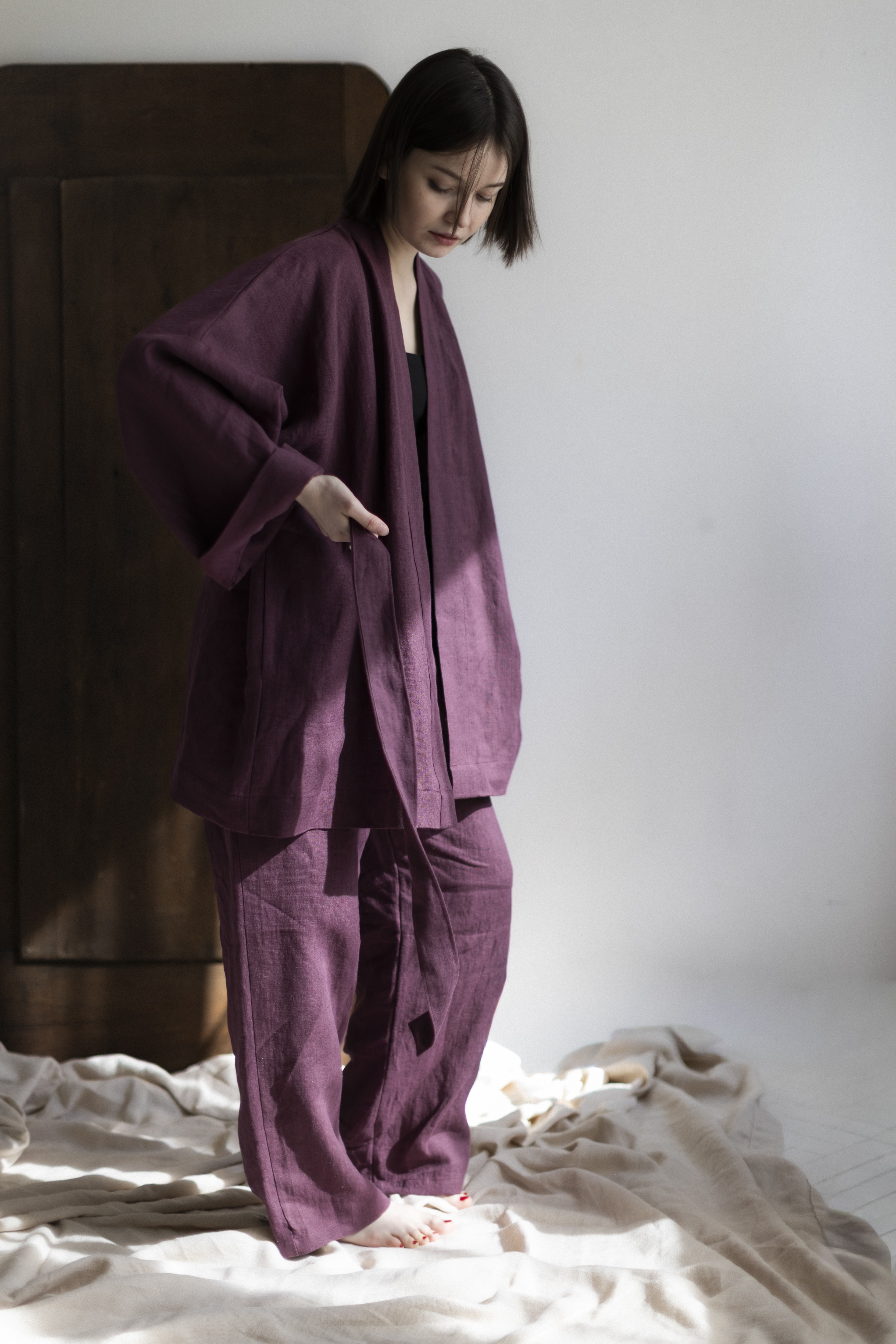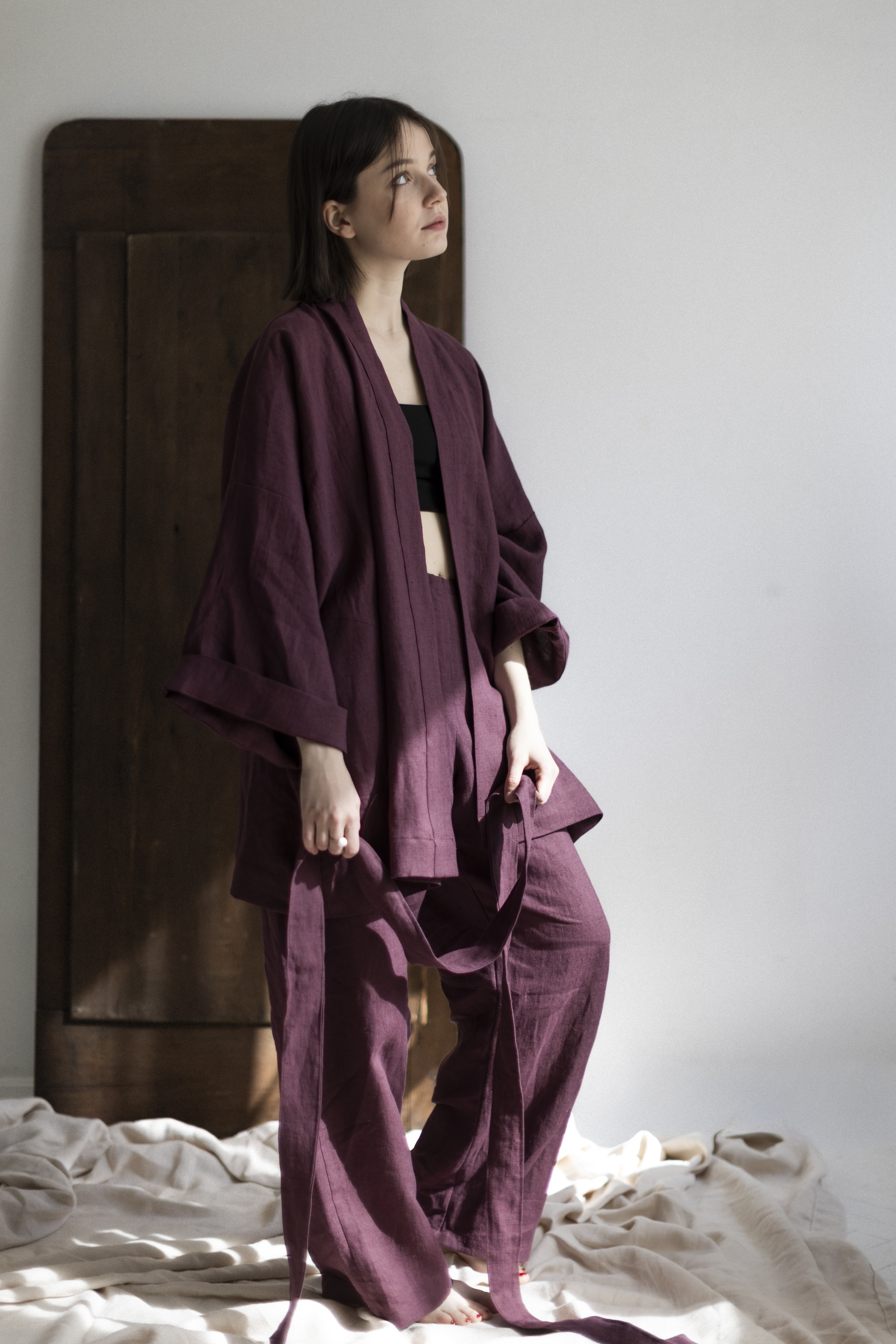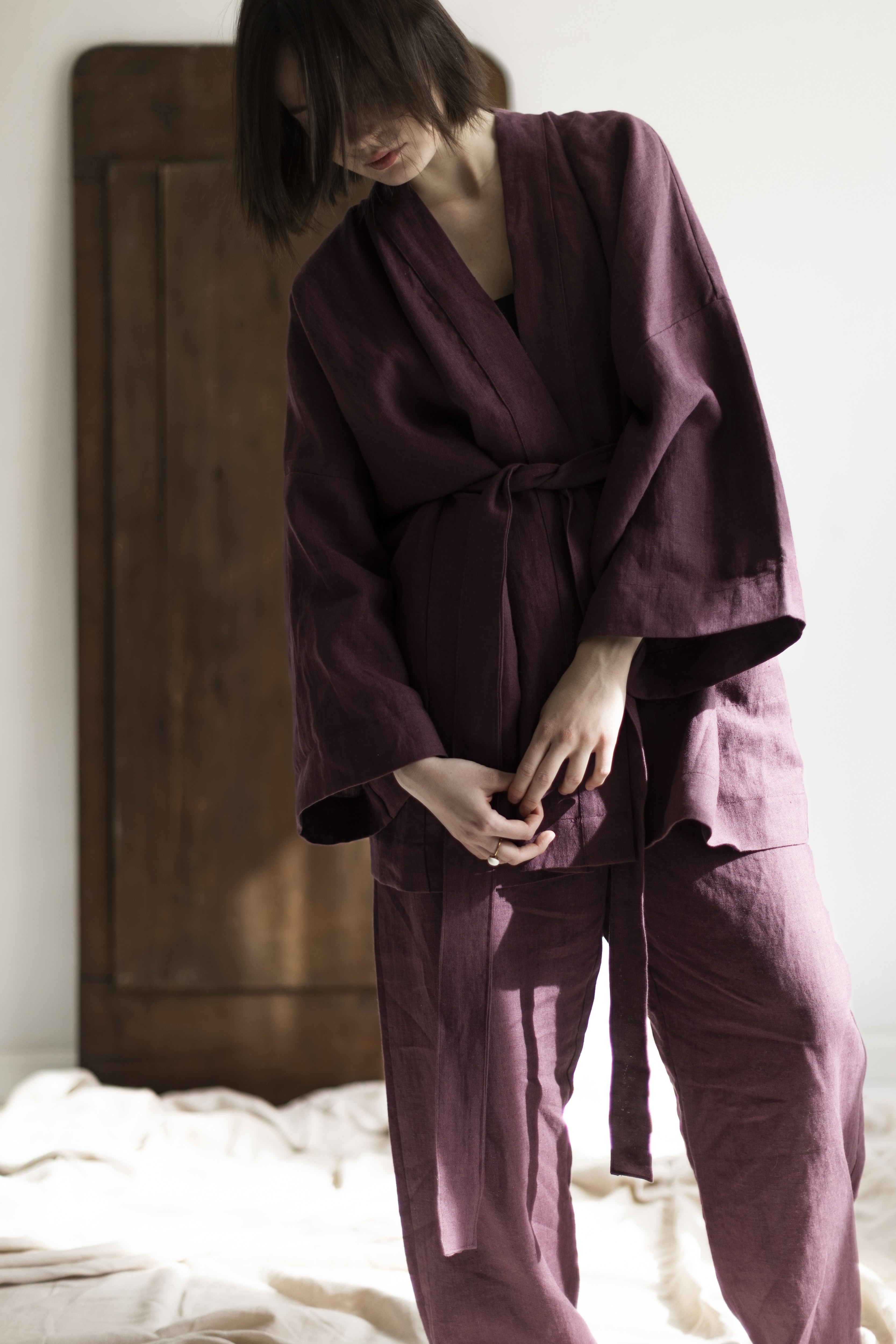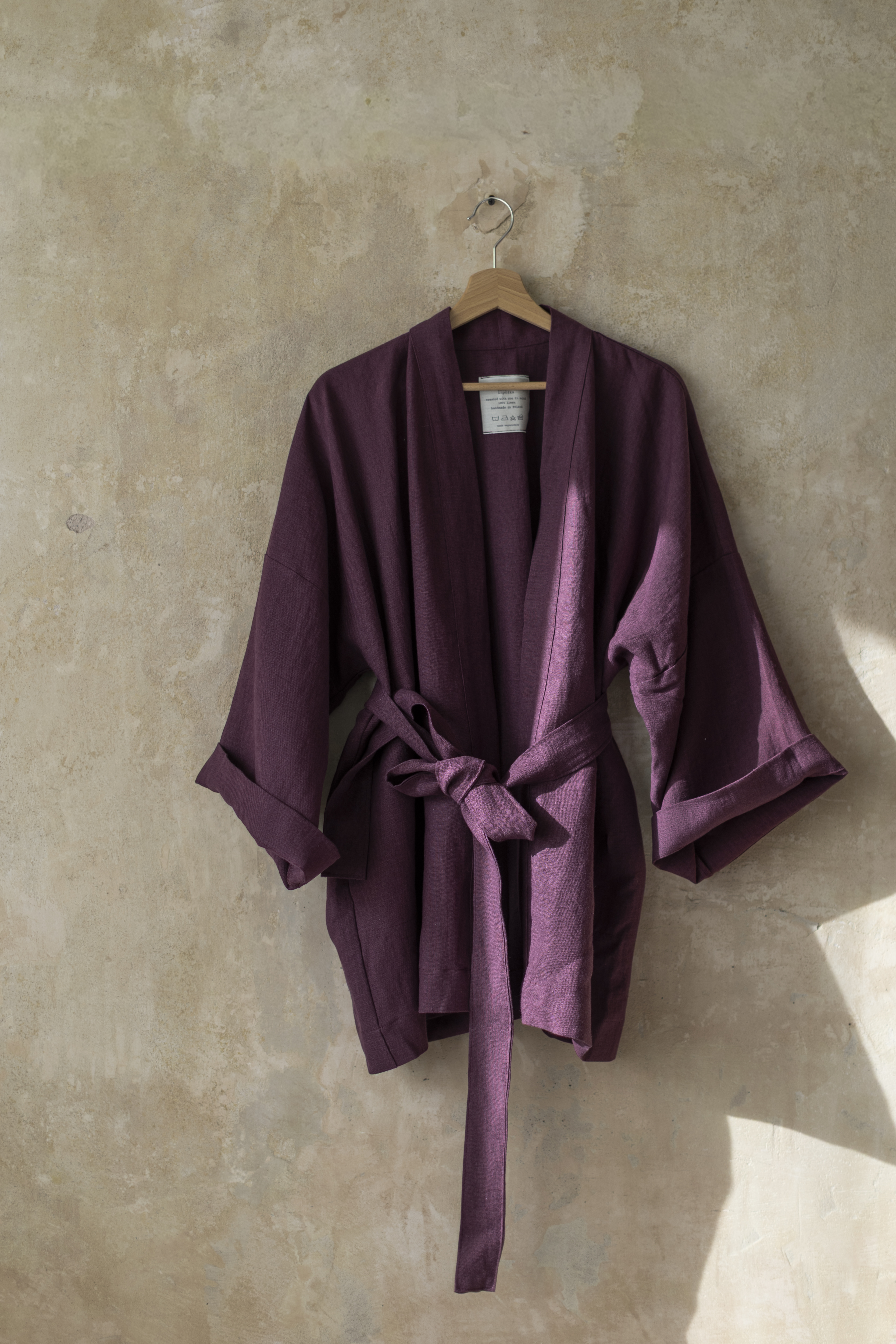 To nie tylko kimono. To chwila dla siebie — zamknięta w kolorze prowansalskiej figi, miękkości lnu i formie, która pozwala Ci być dokładnie taką, jaką chcesz.