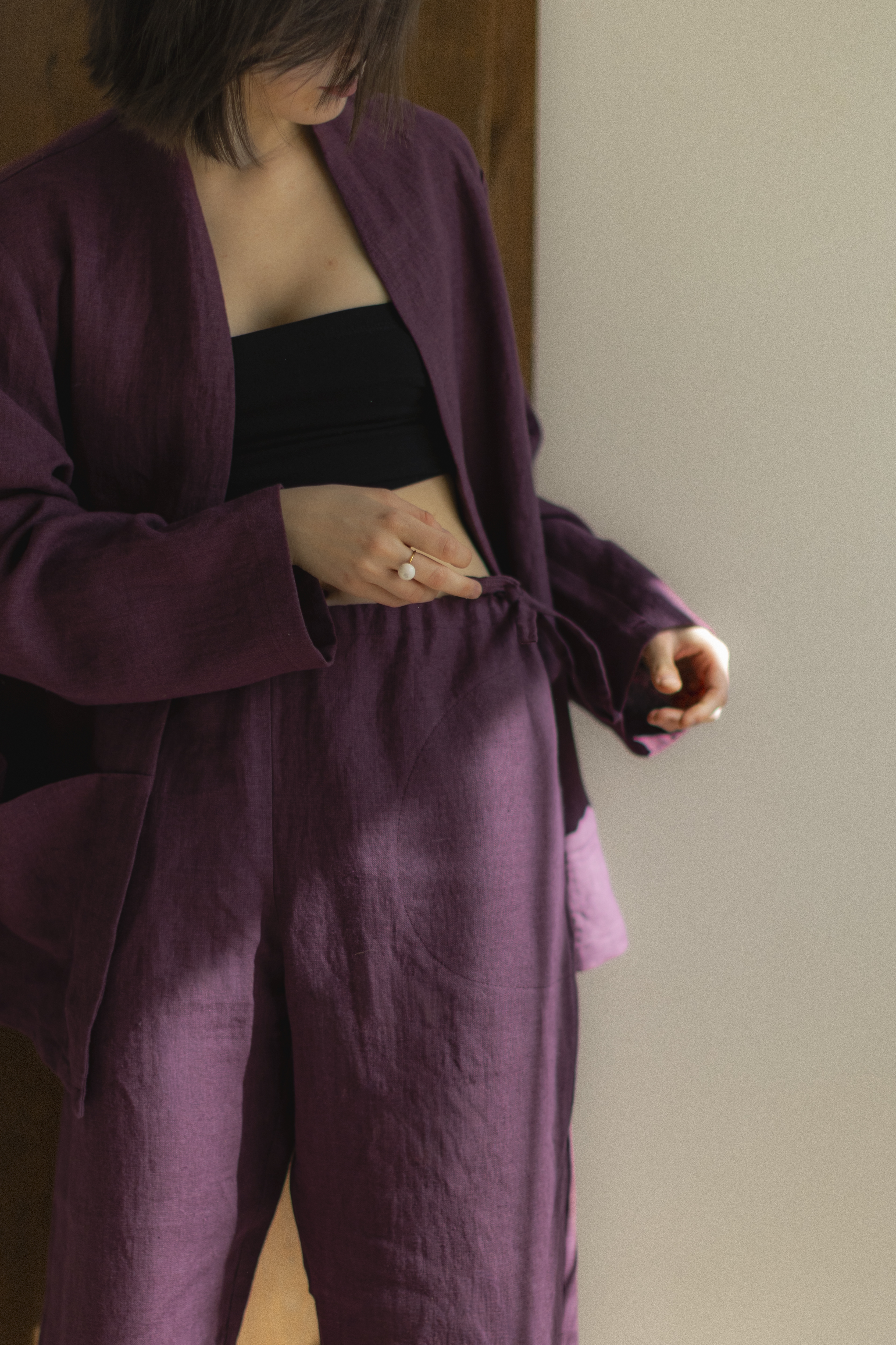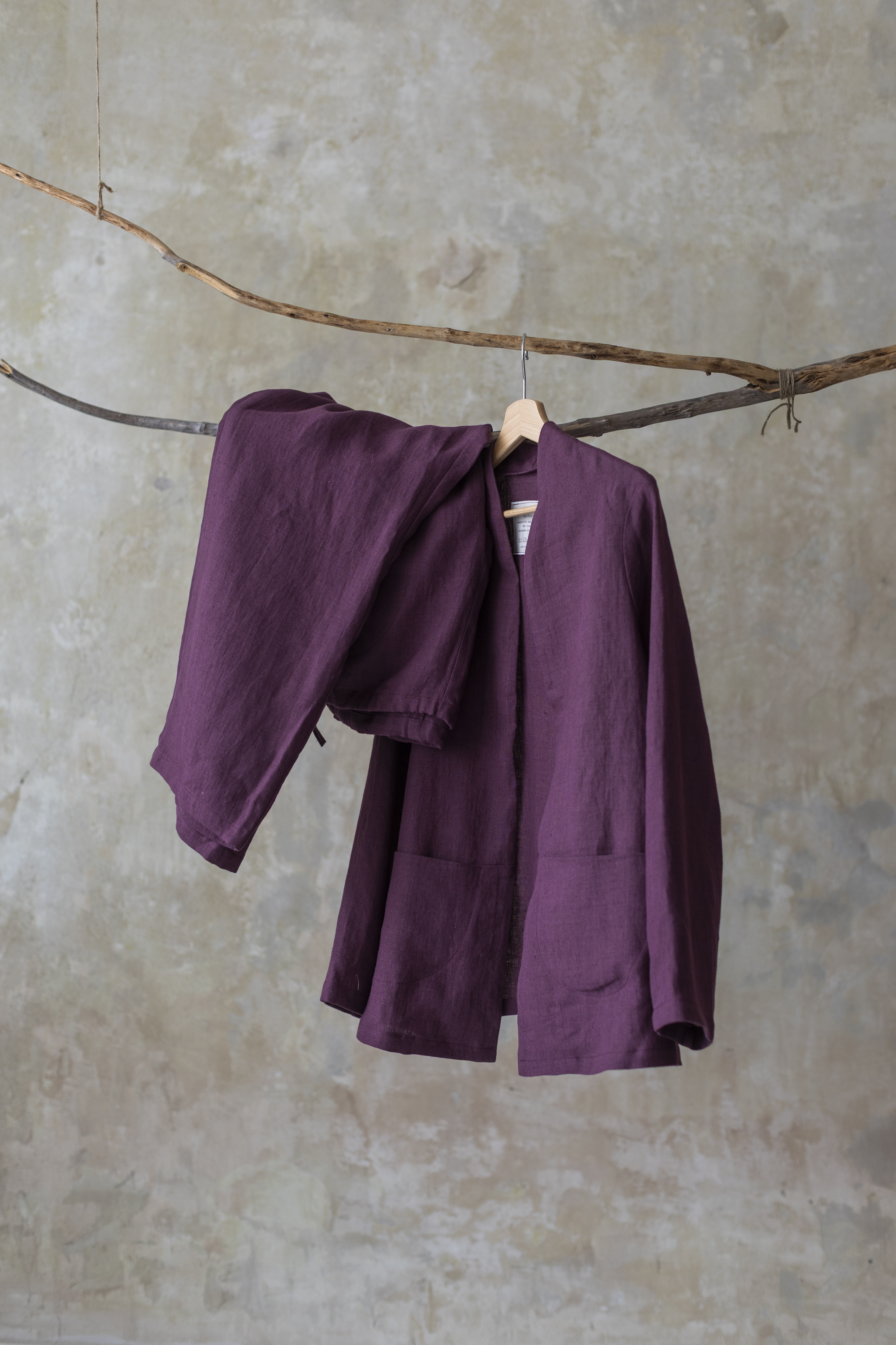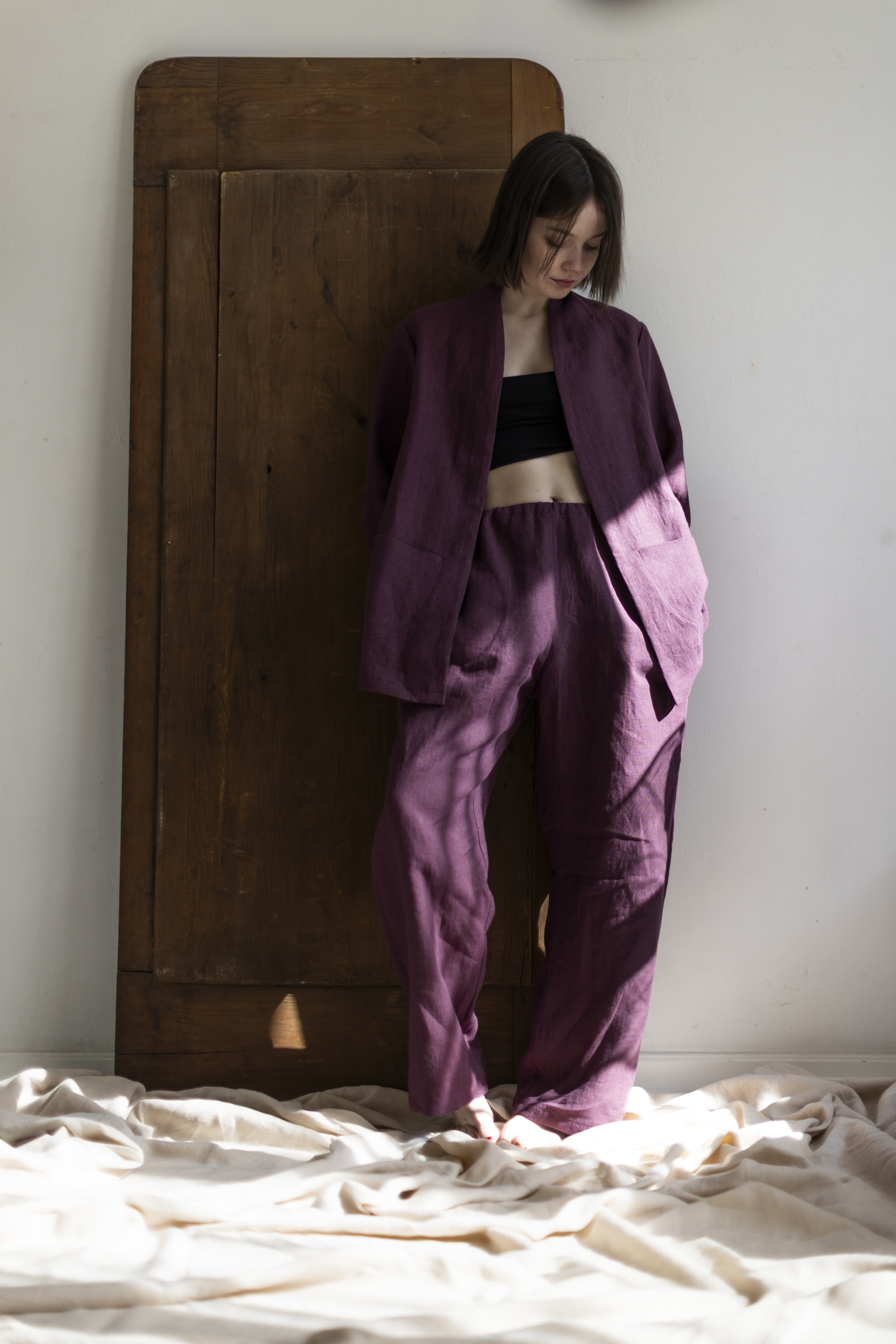 Lniany garnitur w kolorze prowansalskiej figi – ręcznie szyty w Polsce