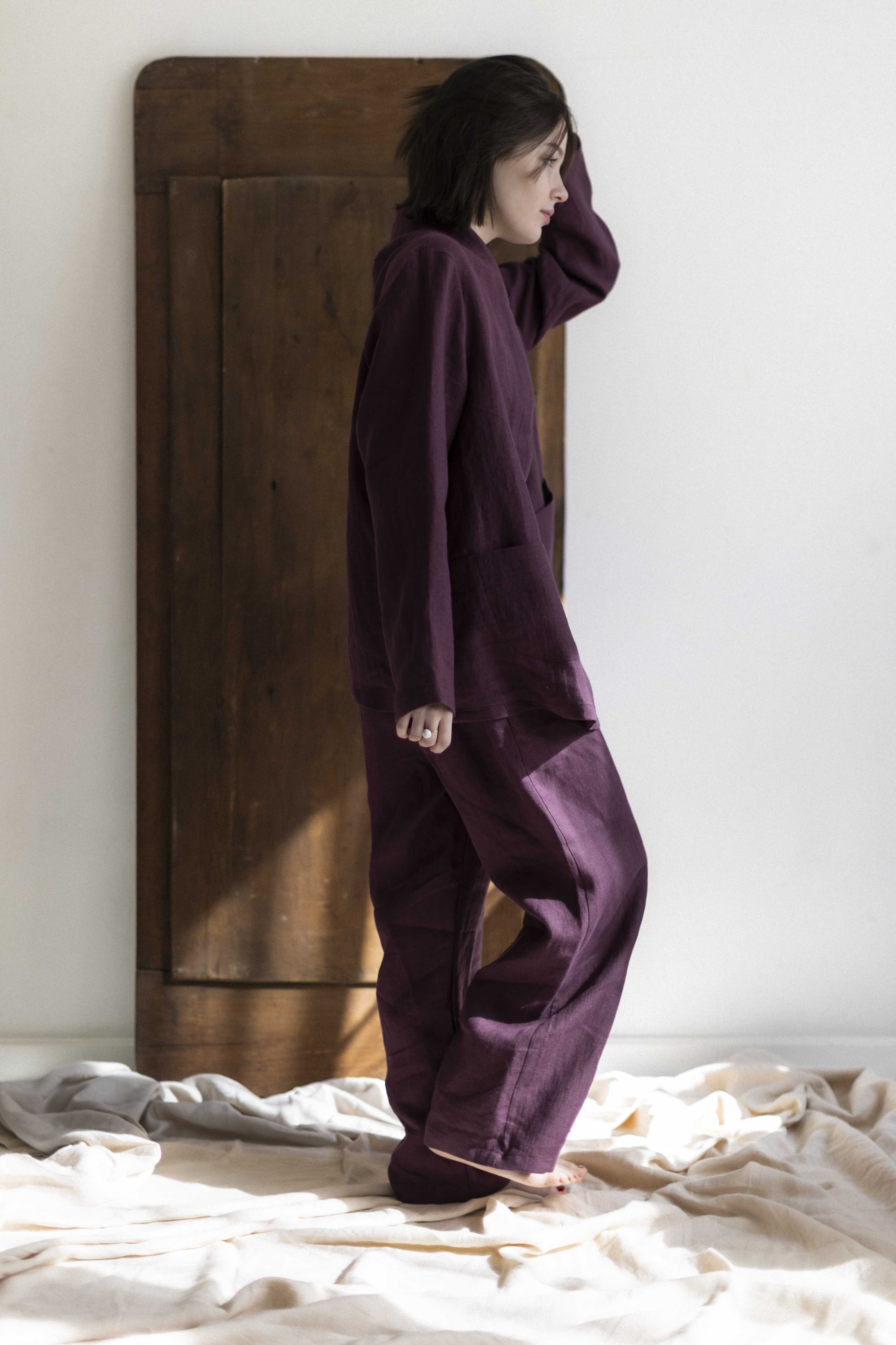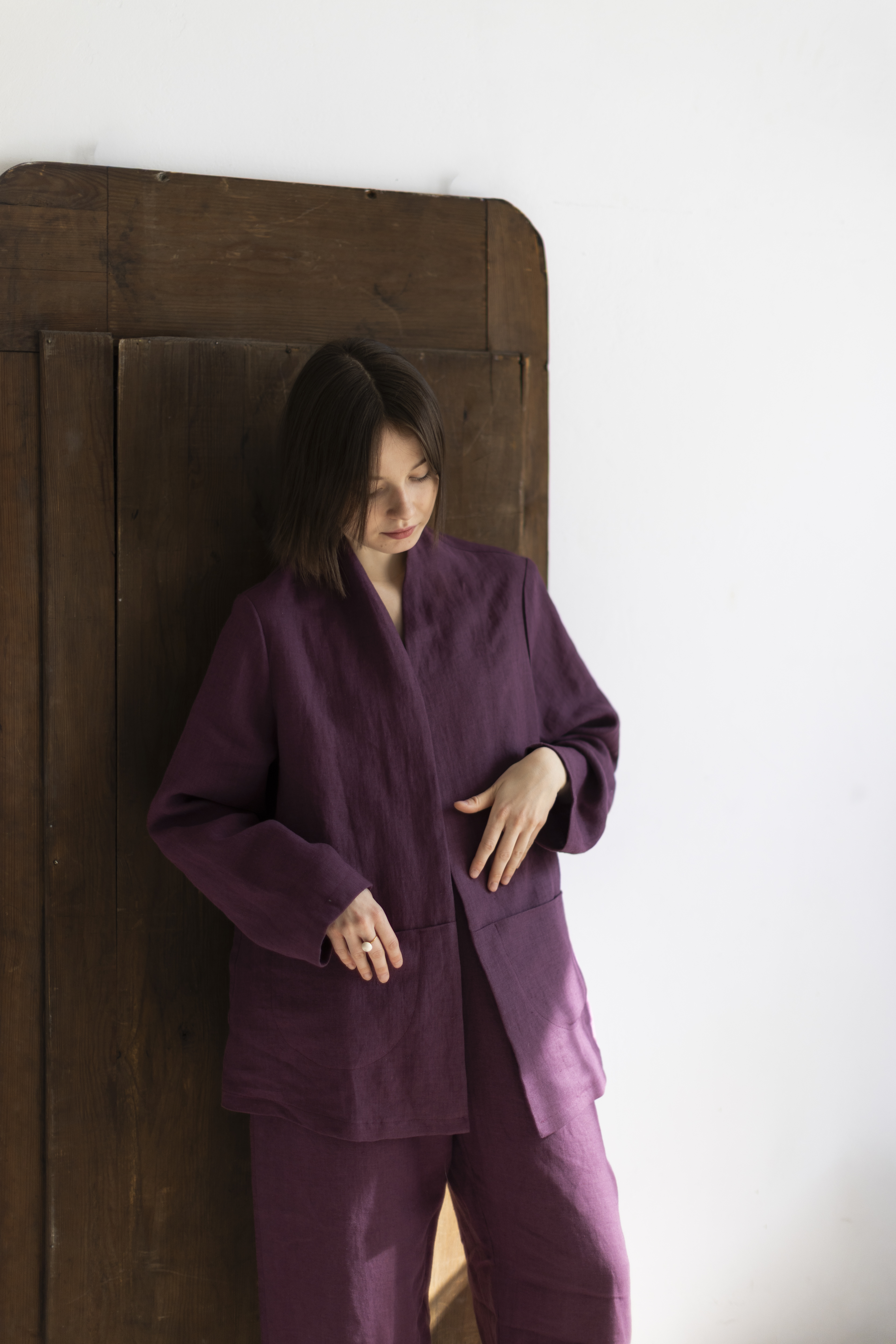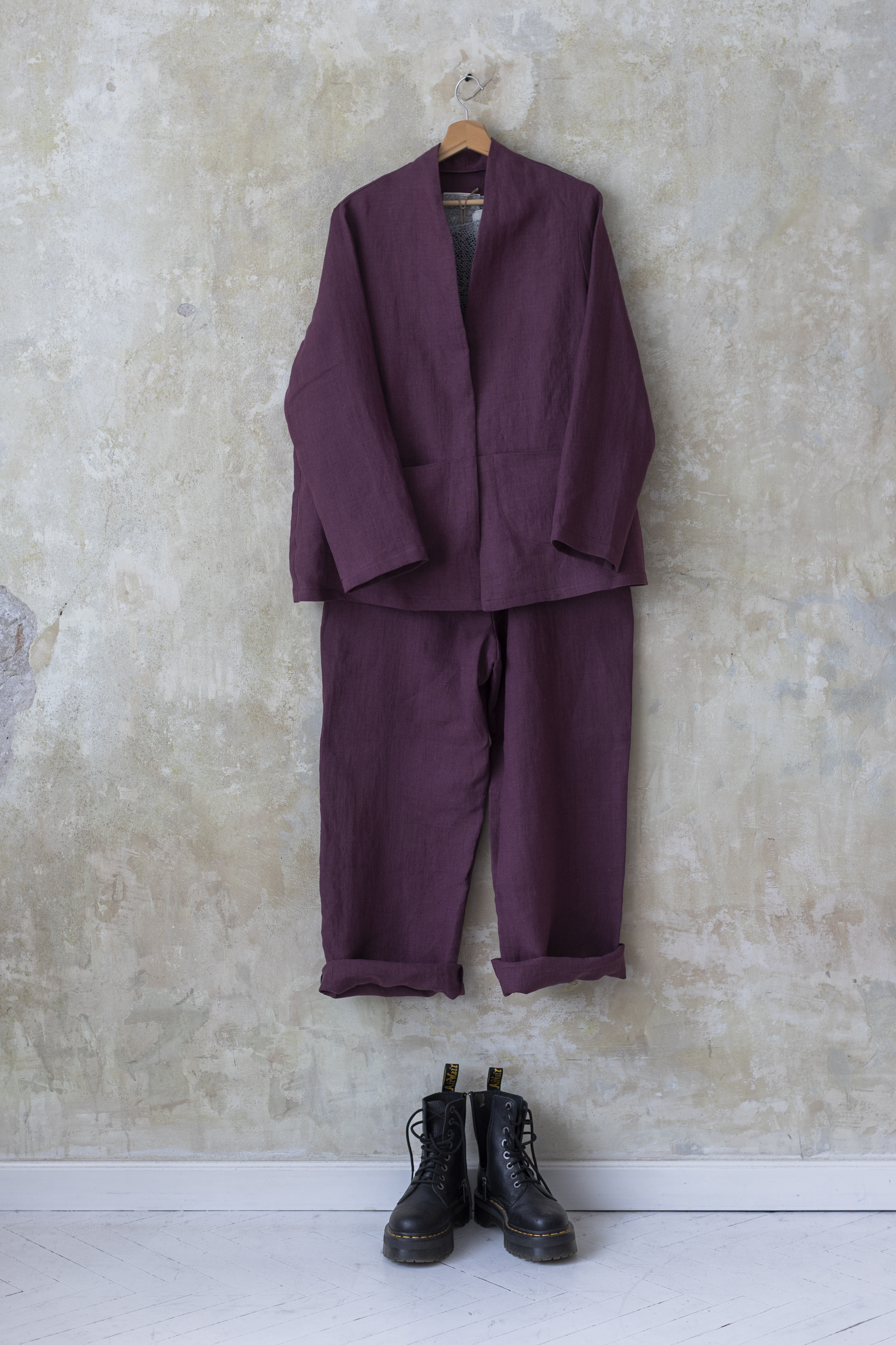 Lniany garnitur w kolorze prowansalskiej figi – ręcznie szyty w Polsce