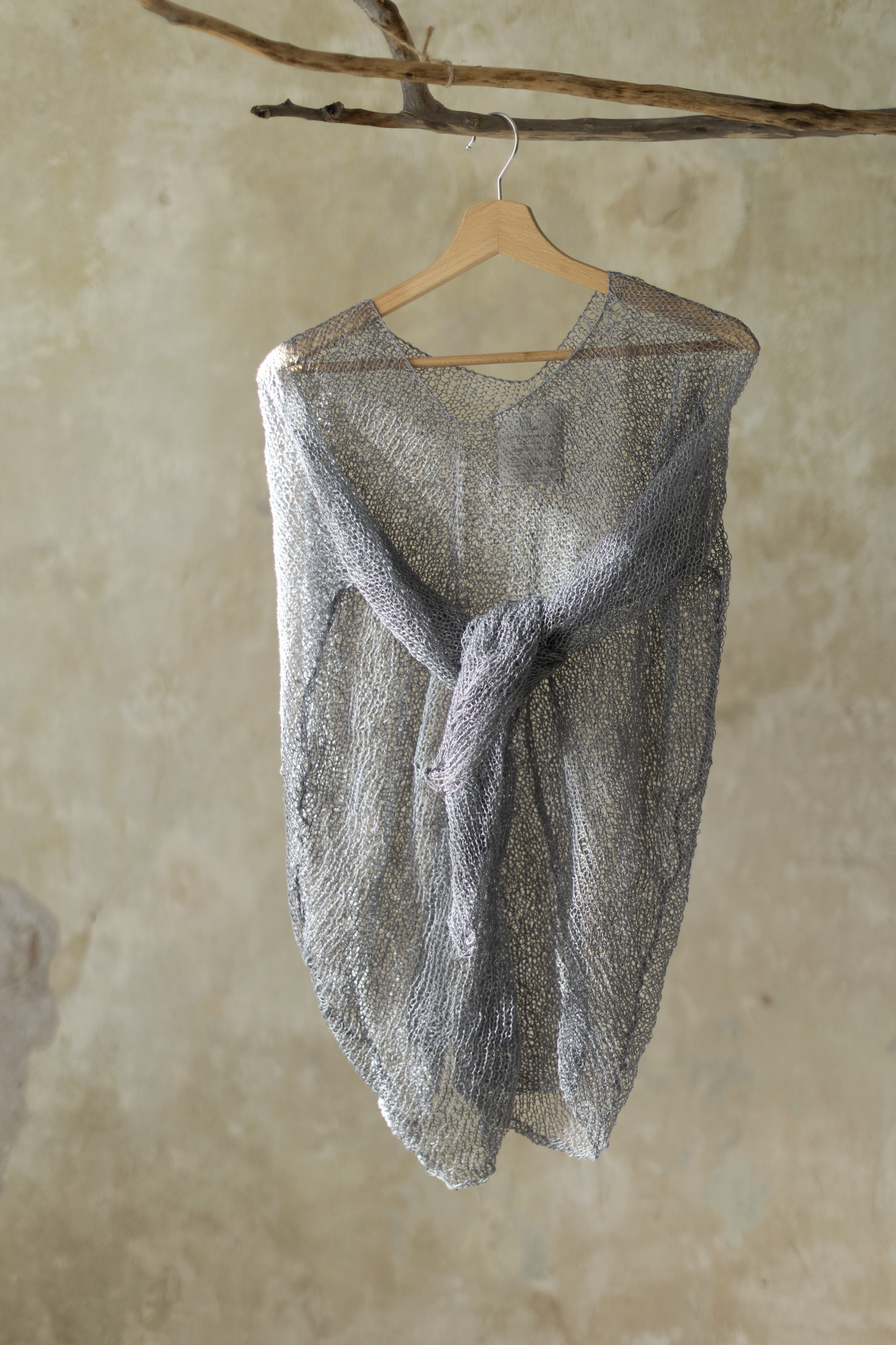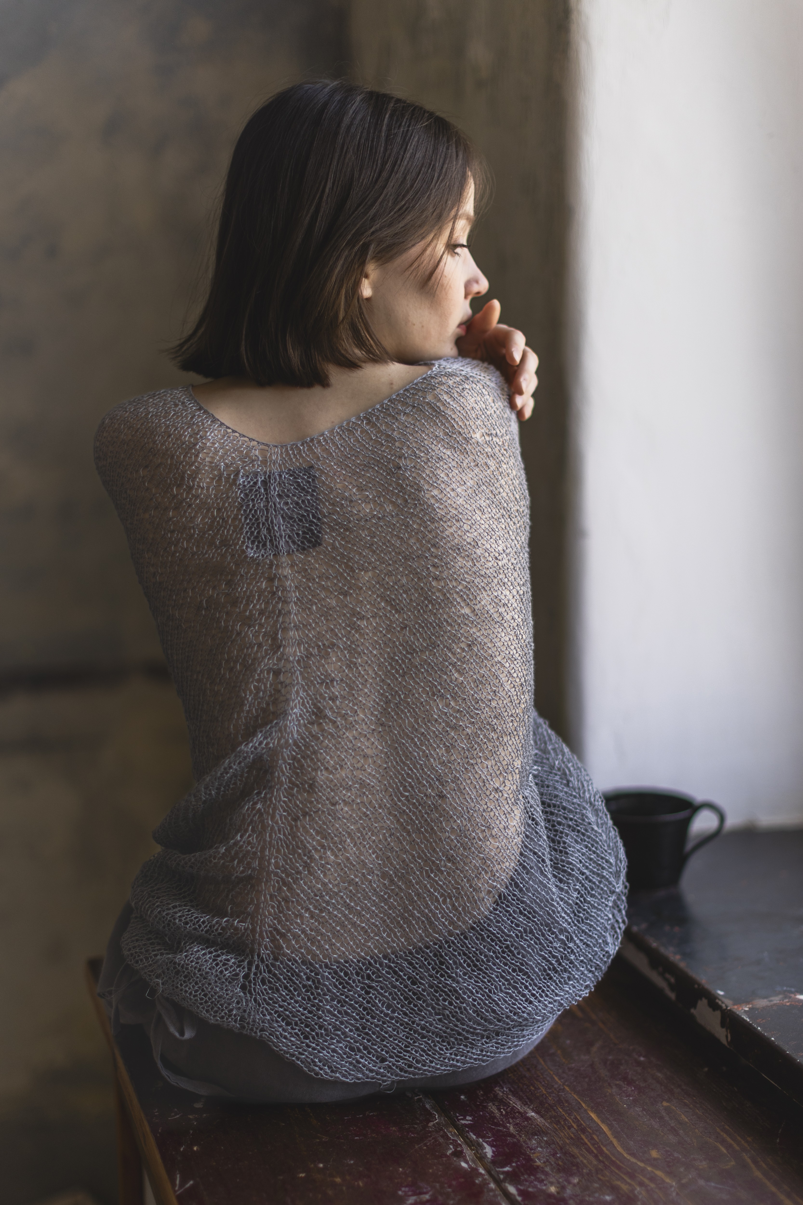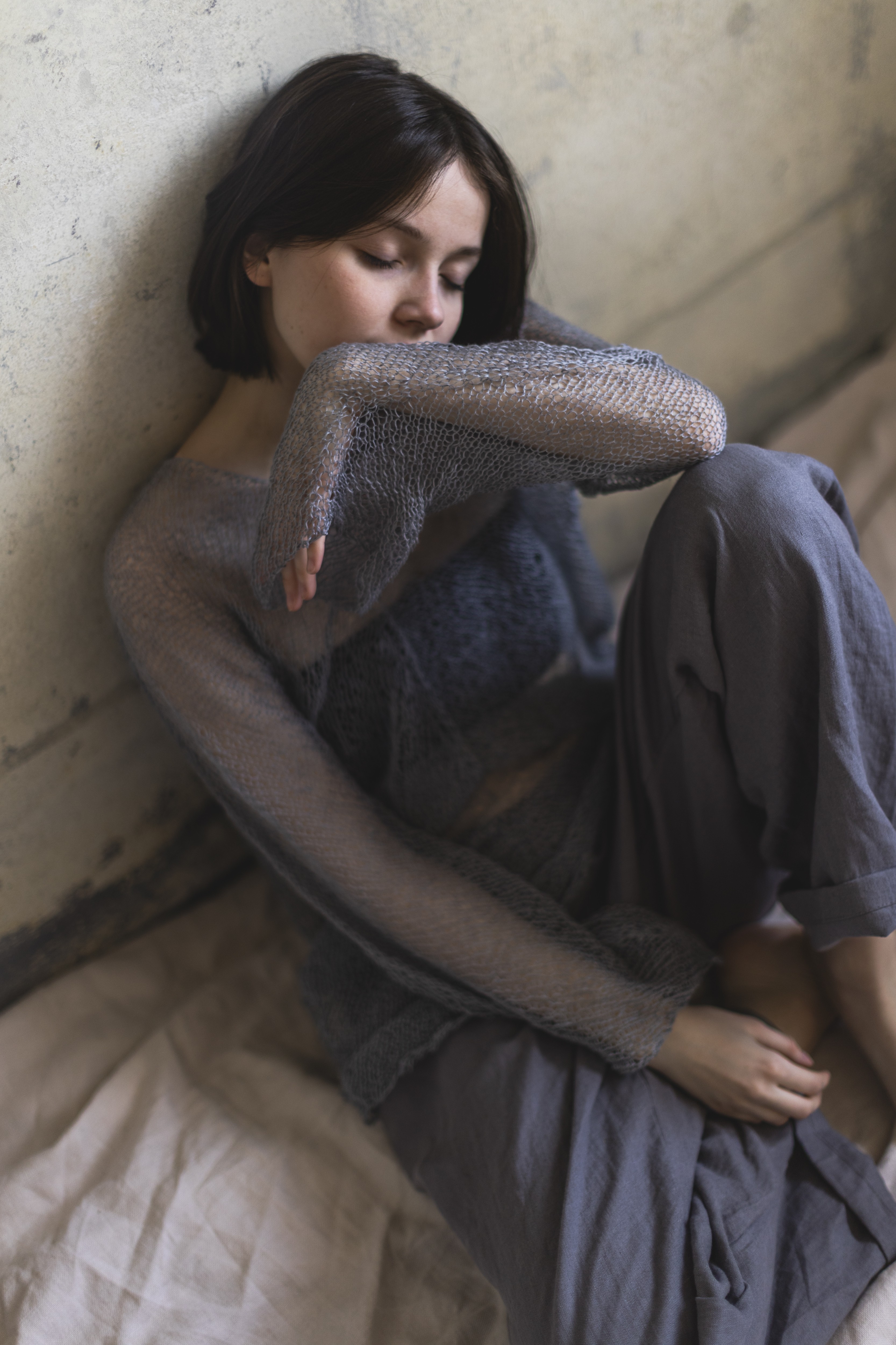 Lniany sweter damski w odcieniu szarego „Genius Loci” – ręcznie dziergany w Polsce
